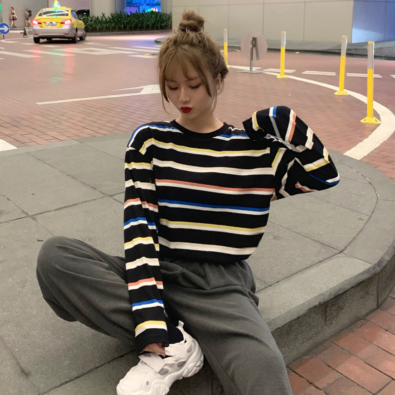 Rainbow T Shirt Women Striped Kawaii Clothes Harajuku Korean Style Streetwear Aesthetic Long Sleeve Fall Roupas Feminina O Neck