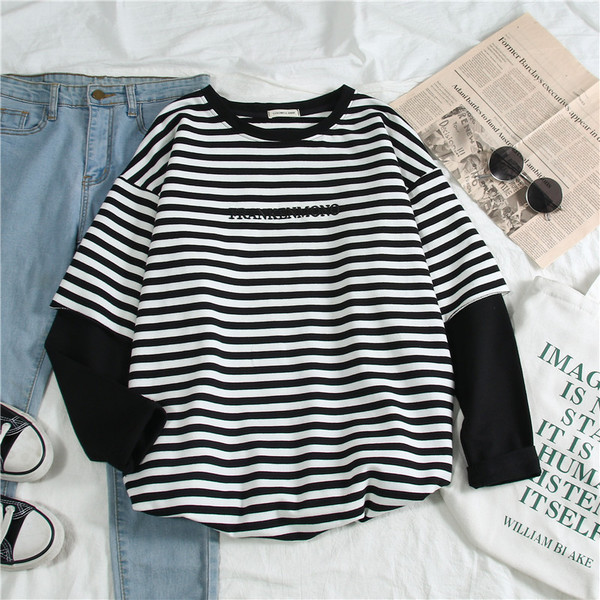 Korean Women t-shirts letters stripe Patchwork tops O-Neck All-match Students tee shirt autumn fashion Large size Casual T shirt