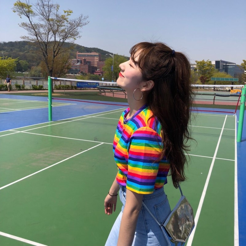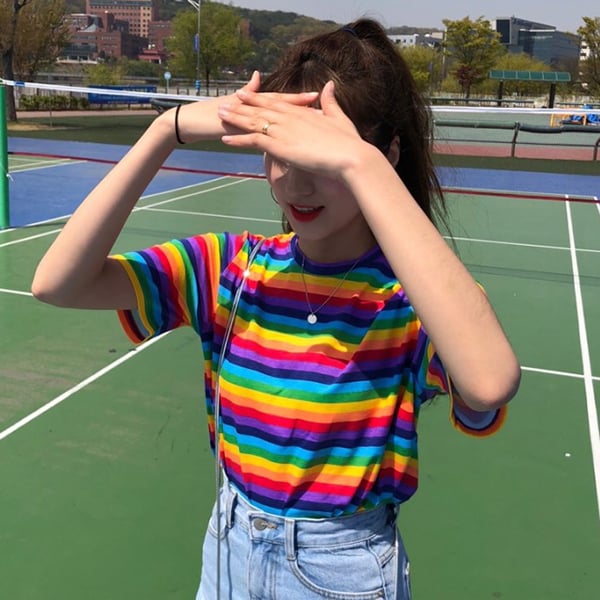 2020 Female Korean Harajuku Casual Loose Rainbow Striped T Shirt Women's T-shirts Tops Japanese Kawaii Ladies Clothes For Women