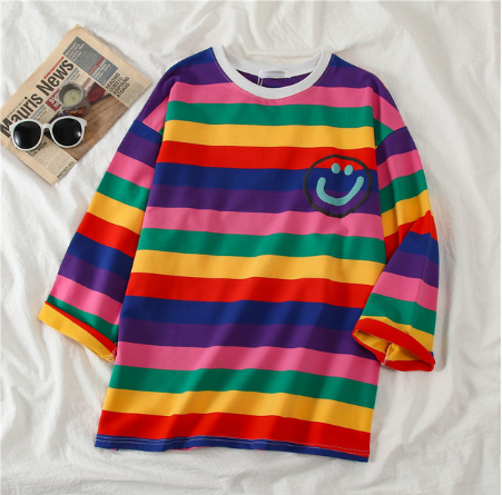 kawaii rainbow stripe t-Shirts autumn Women Casual Loose long Sleeve