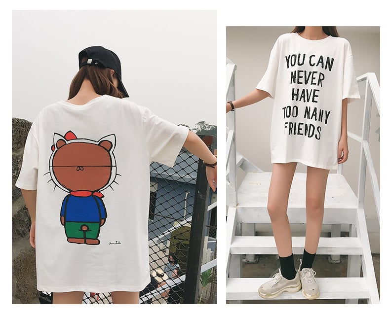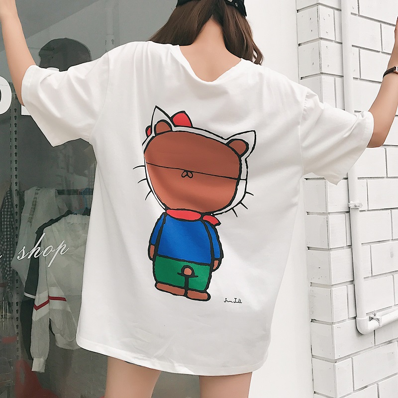 Summer New Korean Style Fashion T-shirts for Female Basic O-Neck long T-shirt cartoon printed Short Sleeve loose tee Tops