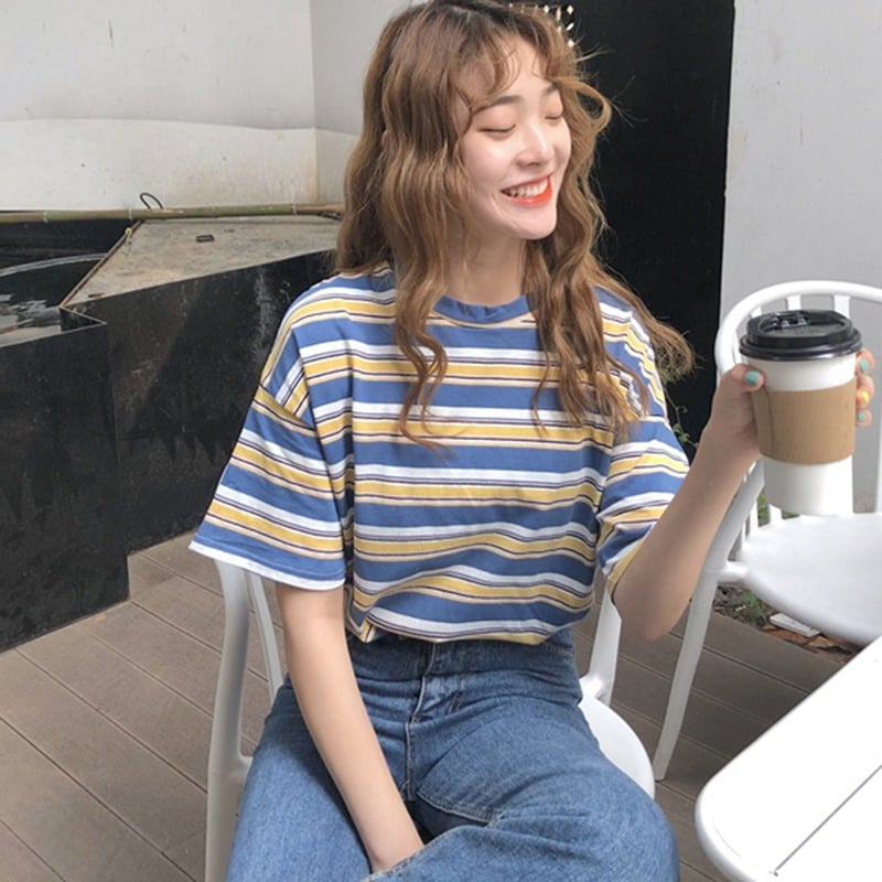 Korean O-neck T Shirt Women Harajuku Striped Tshirt Tops Summer Loose Casual Short Sleeve Punk T-shirts camiseta feminina