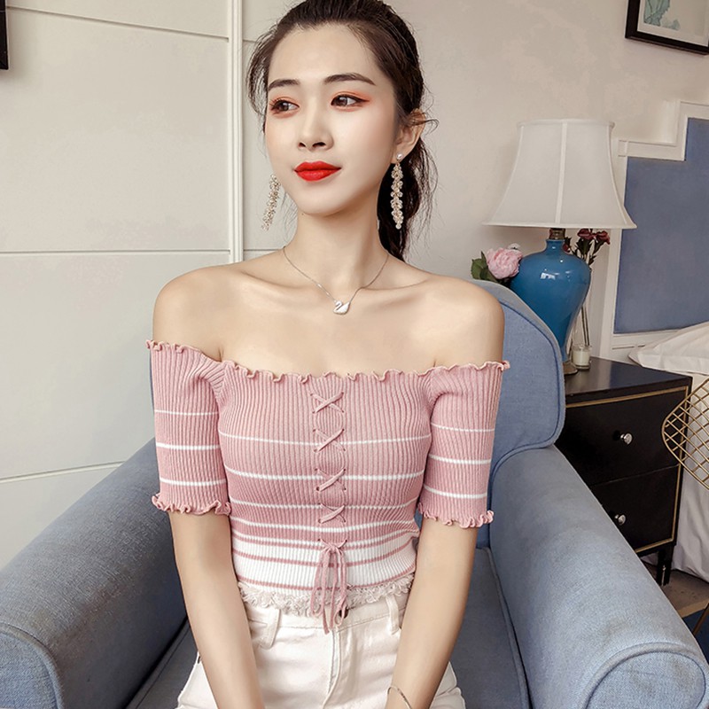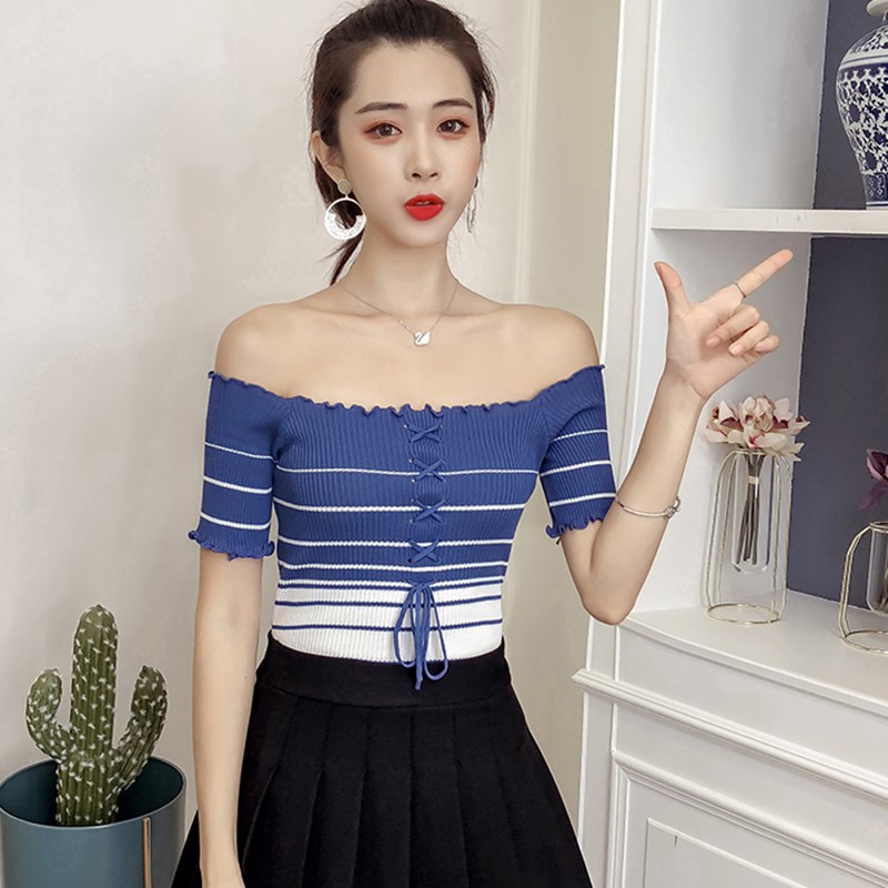 Women Ruffles Low Cut T-Shirt Bandage Short Sleeve Knitted Tee Tops Sexy Slim Striped Tee Shirt Casual Tops