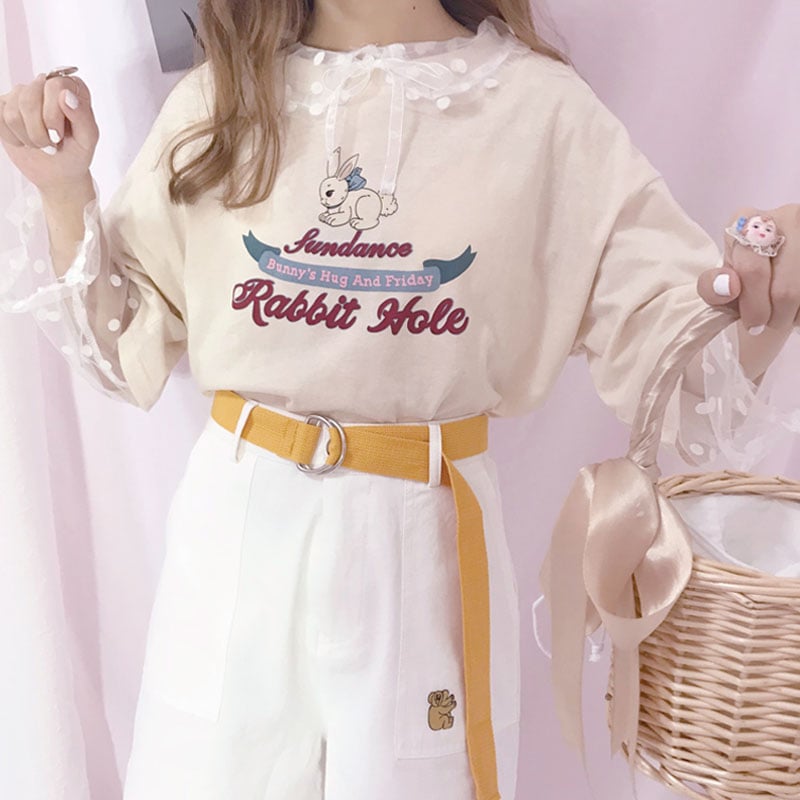 Beige Cute Rabbit Hole Print Femme Casual Tshirts