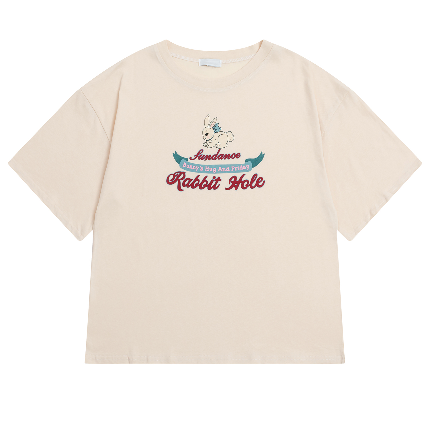 Summer New Women Fashion Loose T-shirt Short Sleeve Beige Cute Rabbit Hole Print Femme Casual Tshirts O Neck Tees Tops Preppy