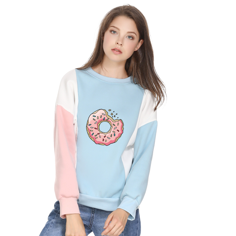 Women Sweatshirt Harajuku Kawaii Donuts Printing Cute Hoodies Patchwork Pastel Contrast Color O-neck Winter Autumn Clothing Top