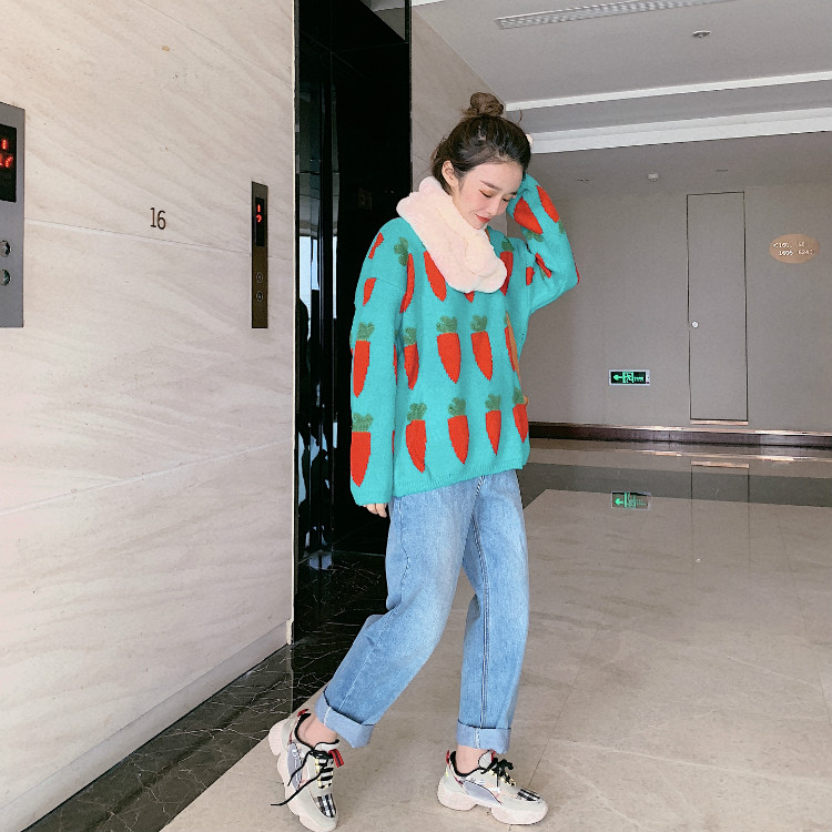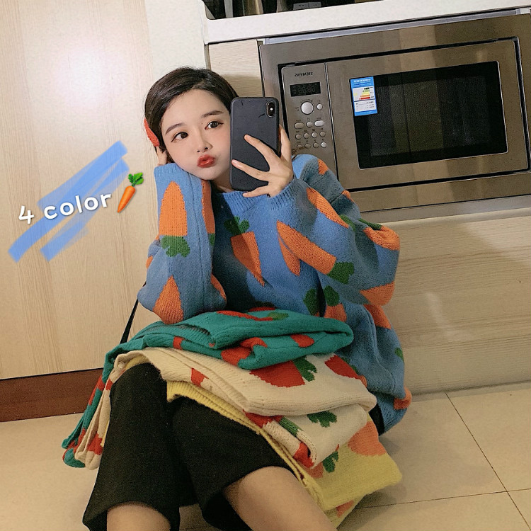 Women's Clothing Cute Kawaii Thick Loose Carrot Embroidery Sweater Lady Harajuku Ulzzang Sweaters For Women Ulzzang Knitted