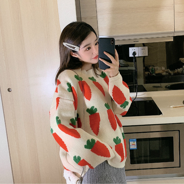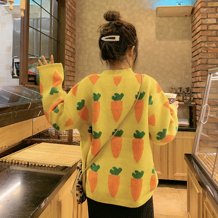 Kawaii Thick Loose Carrot Embroidery Sweater