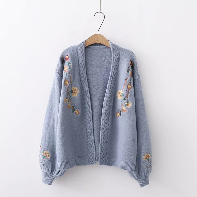 Women Knitted Fashion Cardigan Spring Autumn V-Neck Lantern Sleeve Embroidery Floral Thick Loose Harajuku Female Sweater