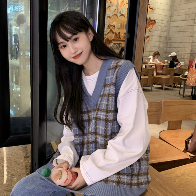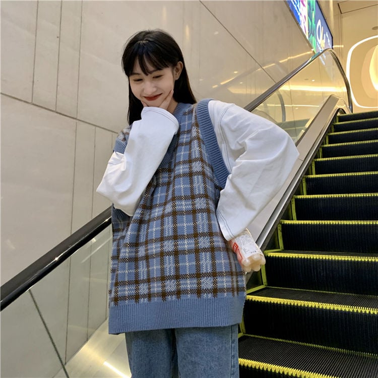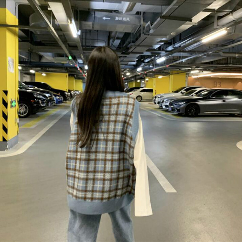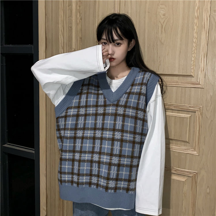 Vest Women Plaid Vintage Harajuku Stylish Street-wear V-neck Sleeveless Sweaters Students Korean-style Loose Casual Fashion Chic