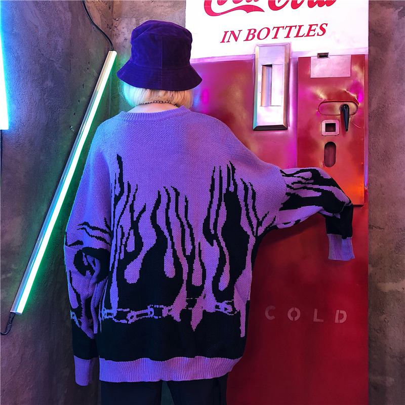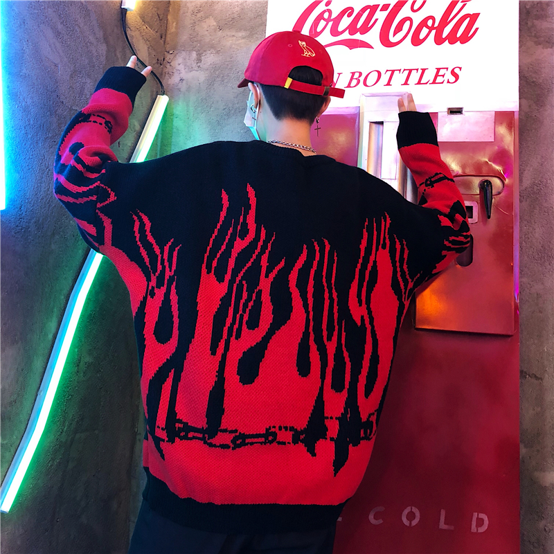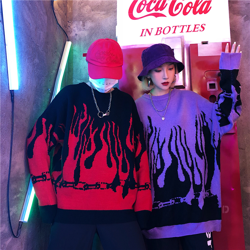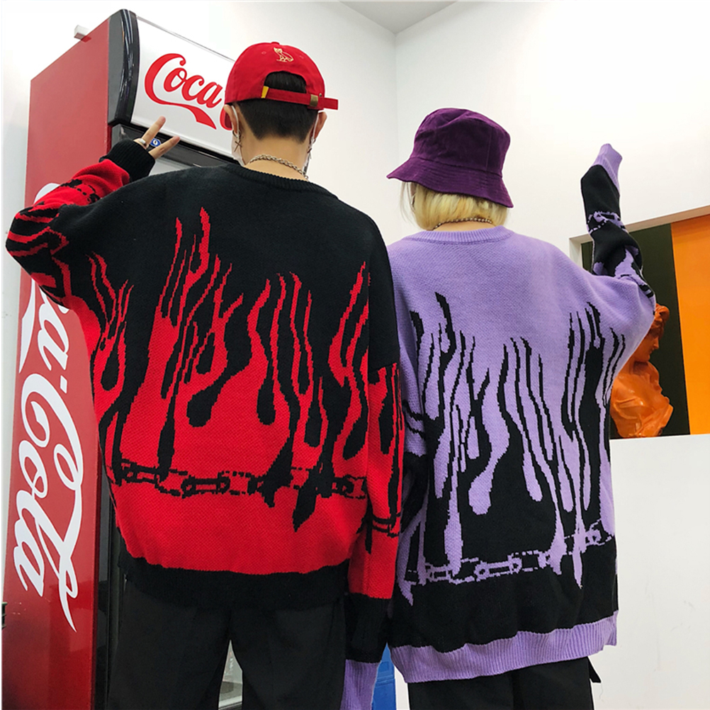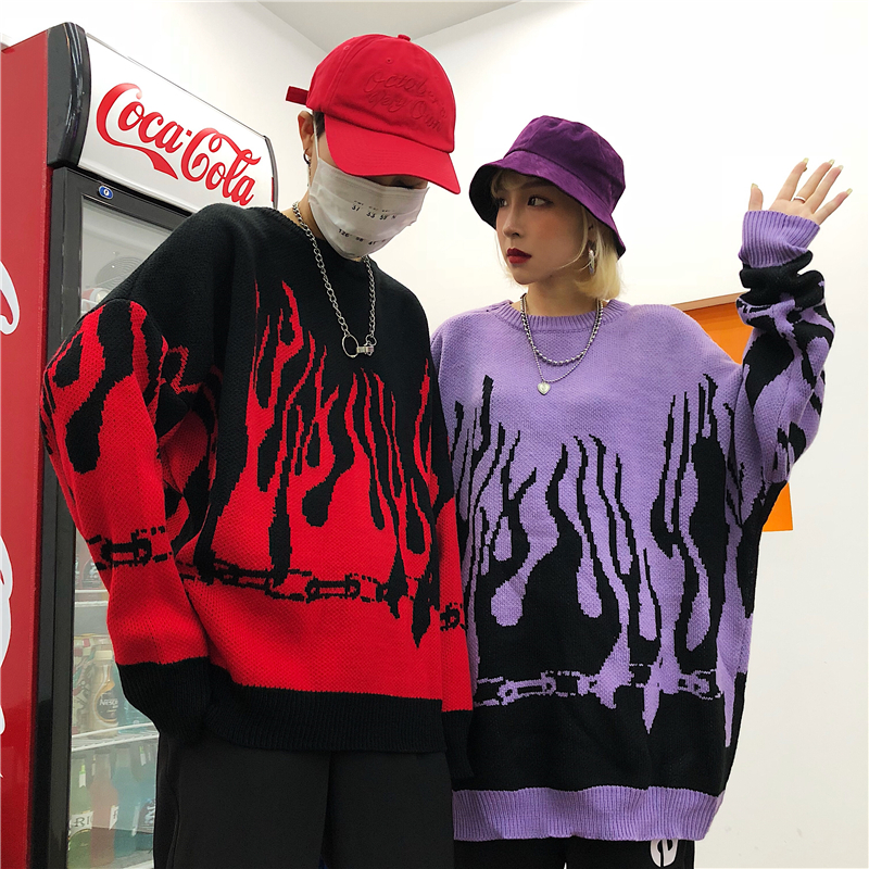 Couple Sweater Harajuku Hip Hop Flame Fire Sweaters Knit 2020 Autumn Winter Man Women Outfits Loose Pullover Fashion Tops Unisex