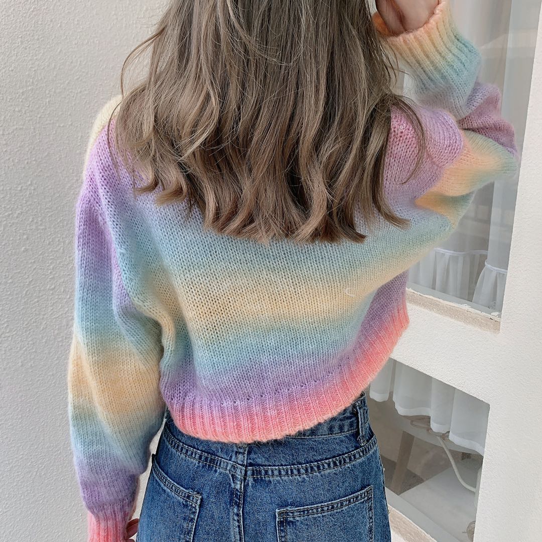 Women Sweet Cardigan Autumn New Long-Sleeve Tie-Dye Sweater Loose V-neck Short Navel Tops Ladies Fashion